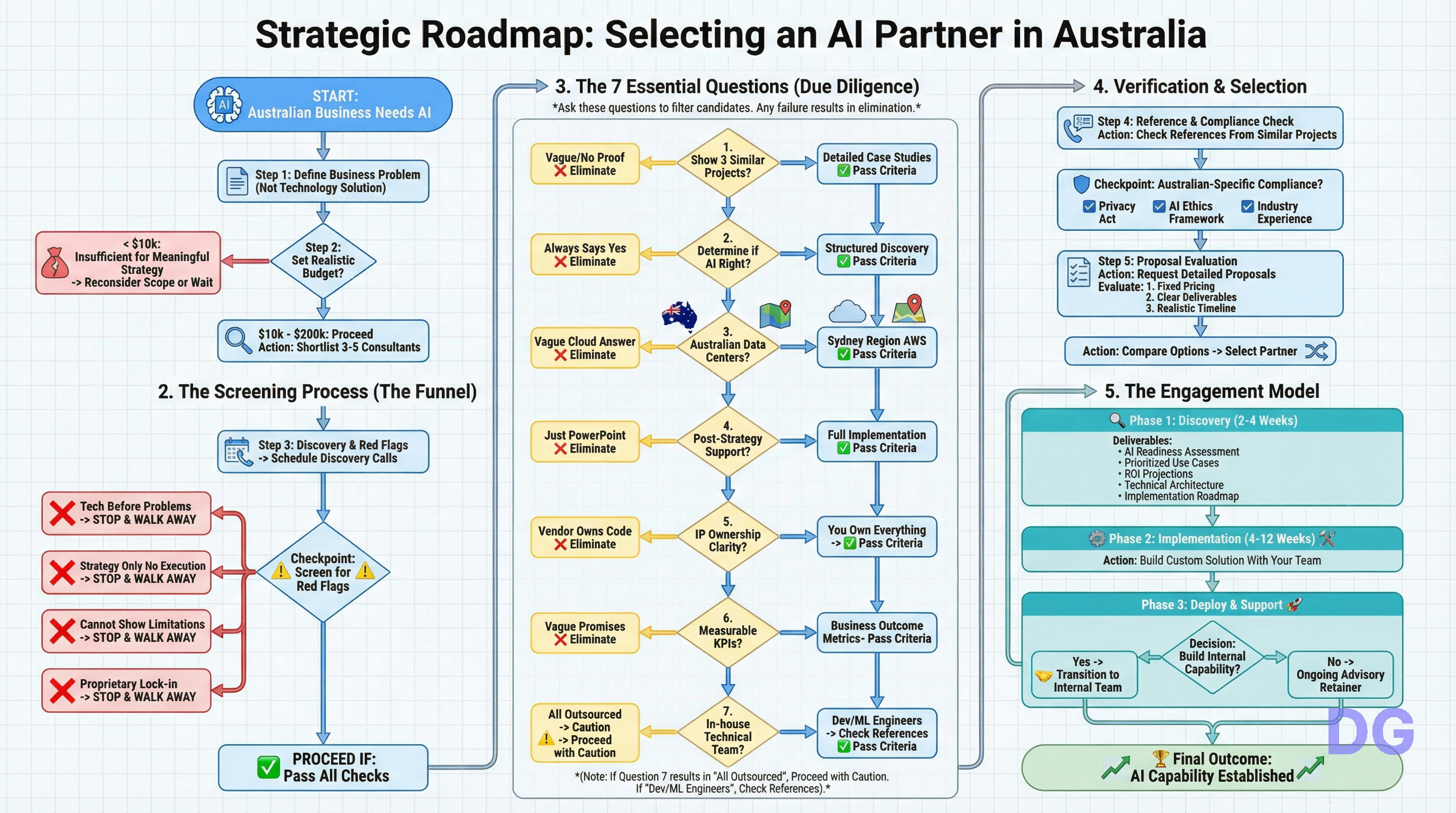 Get expert advice. A free discovery call with an AI consultant can save you months of heading in the wrong direction. Come with your specific use case, your constraints, and your budget. A good consultant will recommend the simplest approach that solves your problem — even if that means suggesting a SaaS tool instead of a custom engagement.
